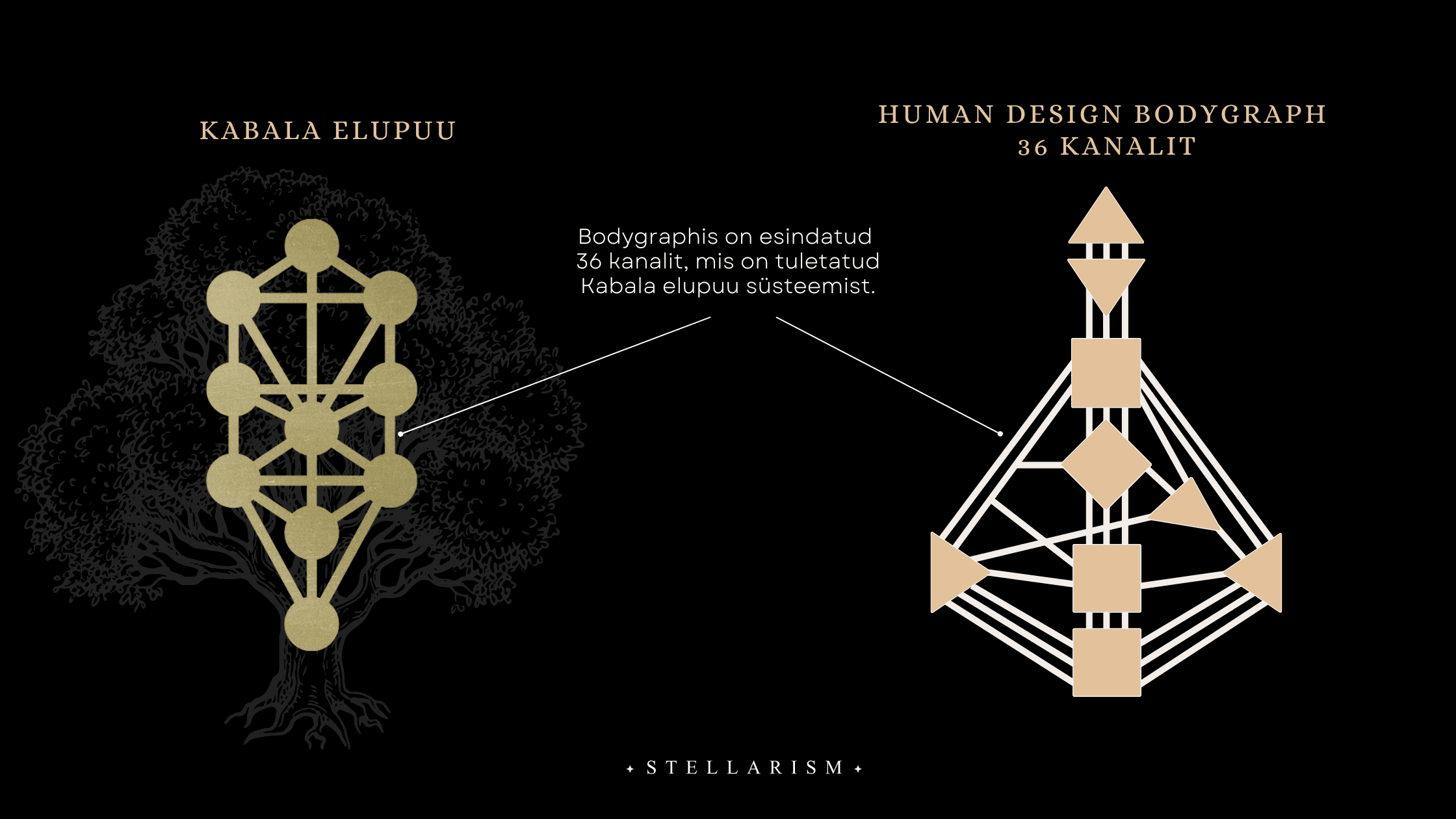 Pildil on vasakul pool näha Kabala Elupuu, mis on juutide müstiline traditsioon, koosnedes 10 sefirast ja neid ühendavast 22 teest. Paremal pool on näha Human Design bodygraph, mis on osaliselt tuletatud Kabala Elupuu süsteemist, kus samuti erinevate energiakeskuste ja väravate vahel jooksevad kanalid, mis neid ühendavad. Human Design’is on kokku 36 kanalit.